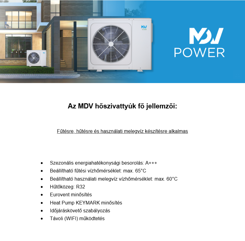 Ön éppen véleményezi: MDV MDVC-V7WD2ER8-P MDV Power monoblokkos hőszivattyú (R32, 7 kW, 1 fázis)